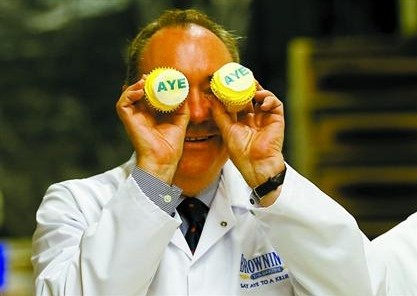 9月3日,苏格兰政府首席大臣萨蒙德在基尔马诺克的一家面包房将两个印有“Aye”(中文译为“赞成票”)字样的糕点放在双眼前。 苏格兰独立公投将于9月18日举行。2012年10月,英国首相卡梅伦与苏格兰政府首席大臣萨蒙德签署苏格兰独立公投协议。经英国议会授权,苏格兰议会有权组织2014年独立公投,英国中央政府和苏格兰政府都表示将尊重公投结果。