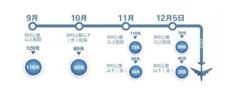据记者了解,天津航空、厦门航空、海南航空已先后发出通知,自12月5日(出票日期)起,国内航线燃油附加费征收标准调整为:800公里(含)以下航段每位旅客燃油附加费由40元调整为30元,800公里以上航段每位旅客燃油附加费由70元调整为60元。这已是今年9月以来,国内航线燃油附加费第四次下调(详见上图)。