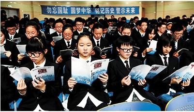 12月1日,南京金陵中学学生在首发式上阅读赠书南京大屠杀死难者国家公祭读本《警示思考》。