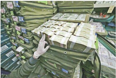 银行工作人员将残损币整理打捆后,准备送走统一处理。