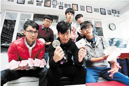 魔法工作室内,胡义(前排中)与同样爱好魔术的朋友们一起钻研和交流技能。
