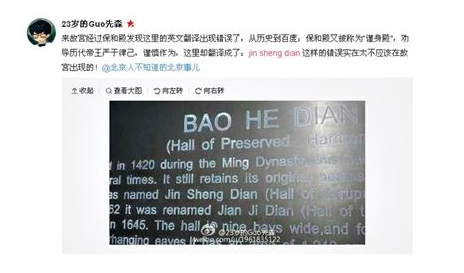 发微博的23岁大学生小郭回忆,当天他和朋友到故宫游玩,当走到到保和殿时,发现标识牌上英文翻译的内容“有点不对”。