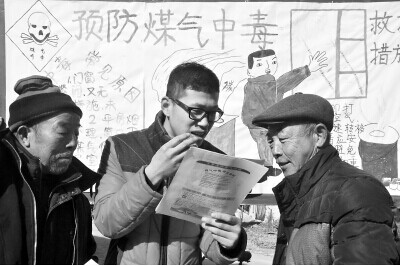 日前,大学生志愿者刘兆雷在向村民讲解预防煤气中毒的措施。山东聊城大学化学学院大学生志愿者来到聊城市马官屯村,开展冬季预防煤气中毒宣传活动。志愿者们通过向村民讲解冬季取暖安全防护措施以及煤气中毒的危害,并现场演示遇到煤气中毒的抢救方法,向村民宣传冬季安全知识和自我保护方法,增强村民的安全保护意识。志愿者们还发放了200余份预防煤气中毒的宣传单,受到村民们的欢迎。(赵玉国 陈昌盛 摄)