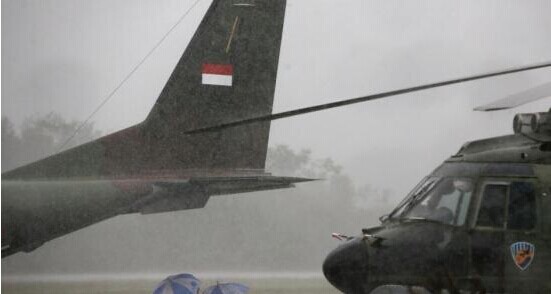当地时间2015年1月4日,印度尼西亚庞卡兰布翁,印尼空军在暴雨中登机,前往搜寻亚航QZ8501航班遇难者遗体。