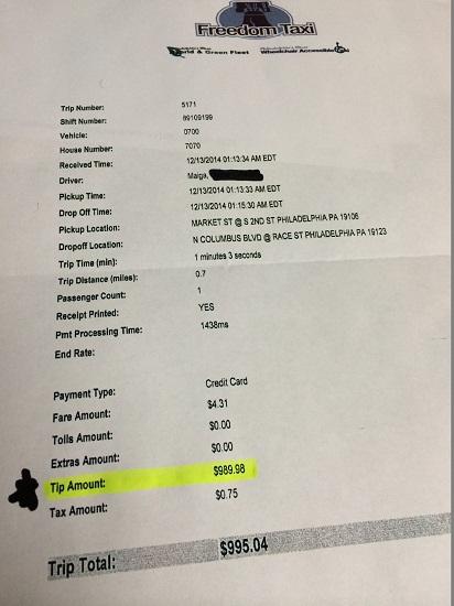 黄色高亮部分显示,搭乘出租车的神秘乘客付给出租车司机梅加995.04美元小费。