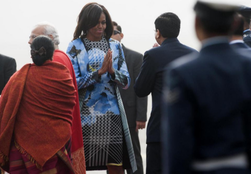 米歇尔抵印时身穿由印度时装设计师莫哈帕特拉度身订造的蓝色连身裙及外套