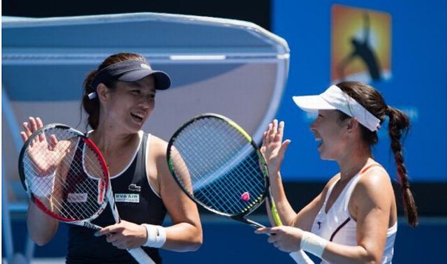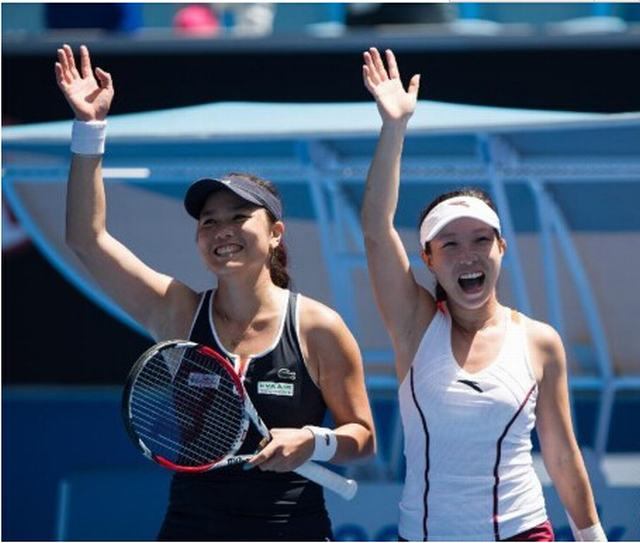 1月28日,中国选手郑洁(右)和中华台北选手詹咏然庆祝比赛胜利。当日,在墨尔本举行的2015年澳大利亚网球公开赛女双半决赛中,中国选手郑洁和中华台北选手詹咏然以2比0战胜荷兰选手克拉吉塞克与捷克选手斯特里科娃,晋级决赛。