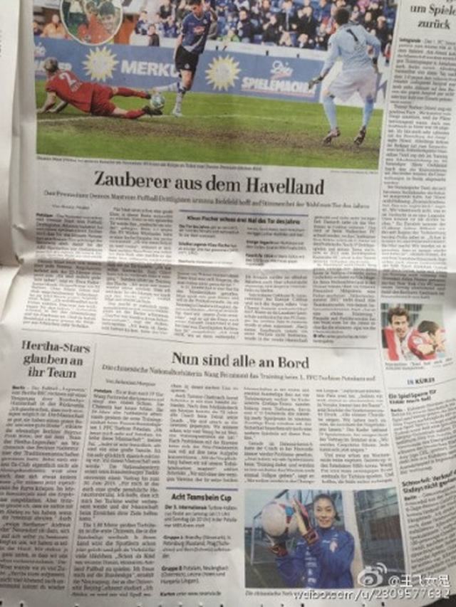 昨天下午,中国女足门将王飞晒出了在德国的照片,同时她还在微博中透露,自己登上了德国报纸的版面。网友留言表示:“以后会经常登的”,并期盼王飞在德国好好努力,为中国足球正名,为自己正名。