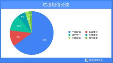 报告统计数据显示,2014年垃圾短信类别主要以广告促销、新闻播报、房产中介、色情违法、诈骗信息和费用账单为主,其中广告促销类所占比例高达65%,家电类、服饰类广告最多,占比分别为31%和23%,汽车、教育、房屋出租等各类广告也层出不穷。