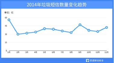 近年来,垃圾短信问题愈发严重,手机用户不堪其扰。近日,百度手机卫士发布《2014年度移动安全报告》,报告显示,截至2014年12月,全国垃圾短信数量高达454亿条,每人每月平均收到垃圾短信9条,其中1月和9月分别以53.1亿条和45.8亿条垃圾短信领跑其他月份。此外,2月份工信部开展垃圾短信集中整治,垃圾短信数量明显下滑,但依然无法根除该问题,垃圾短信数量随后又持续上升。