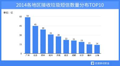 从地区分布看,广东用户收到的垃圾短信最多,高达59亿条,北京用户收到垃圾短信42亿条,排名第二,排名三到十位的分别是郑州、杭州、济南、南京、成都、长沙、福州和上海,皆为国内一线城市。分析认为,这些城市经济发展速度快,人民生活水平高,是垃圾短信肆虐的沃土。
