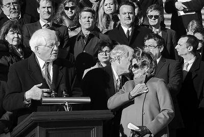 1月13日,美国众议院少数党领袖佩洛西与民主党议员在国会外出席新闻发布会,讨论国土安全部经费提案。