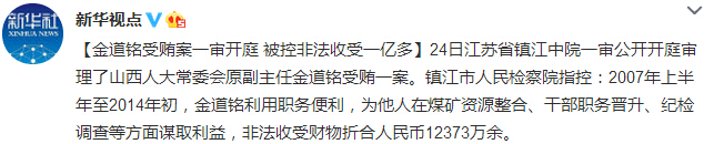 据新华视点微博消息,2月24日江苏省镇江中院一审公开开庭审理了山西人大常委会原副主任金道铭受贿一案。镇江市人民检察院指控:2007年上半年至2014年初,金道铭利用职务便利,为他人在煤矿资源整合、干部职务晋升、纪检调查等方面谋取利益,非法收受财物折合人民币12373万余。