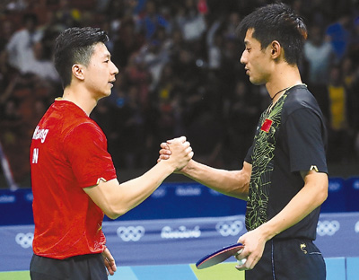 当地时间8月11日,中国队选手马龙(左)和队友张继科在赛后握手致意。