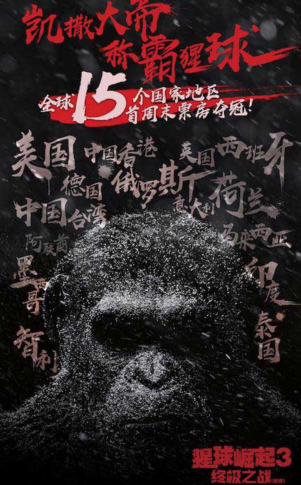 今年好莱坞暑期最佳口碑大片,由二十世纪福斯电影公司出品的《猩球崛起3:终极之战》(暂译),自上周五在北美公映之后,延续了前两集上映首周都拿下票房冠军的强劲开画势头,最终以5650万美元成为上周末票房冠军,超过排名第二的影片1000多万美元。作为该系列的终结篇,无论在票房还是在口碑,《猩球崛起3》都给这个系列画上了完美句号,载入电影史册,成为最成功的科幻三部曲之一。