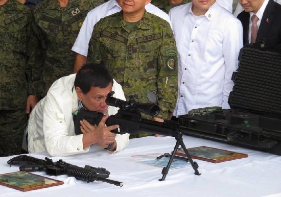 图为菲律宾总统杜特尔特体验中国援助的狙击步枪。(资料图)