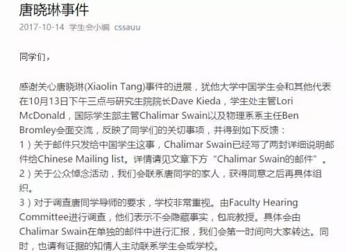 该公众号在发表的文章《唐晓琳事件》中表示,13日当天下午,犹他州大学(University of Utah)中国学生会和其他代表,就由唐晓琳事件在学生中引发的一系列疑问以及相关要求,与校方多位负责人进行了会谈。