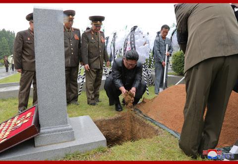 金正恩怀着失去无限忠于党的革命战友的悲痛心情,向墓穴填土。朝鲜武力机关领导干部和故人家属向故人遗骸培土。