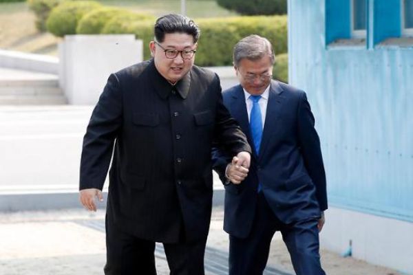 4月27日,金正恩与文在寅挽手跨过军事分界线。