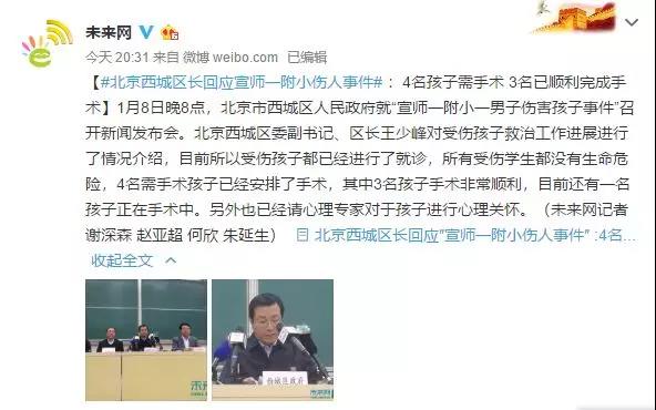1月8日晚8点,北京市西城区人民政府就“宣师一附小一男子伤害孩子事件”召开新闻发布会。北京西城区委副书记、区长王少峰对受伤孩子救治工作进展进行了情况介绍,目前所有受伤孩子都已经进行了就诊,多名学生颅骨凹陷性骨折,所有受伤学生都没有生命危险,4名需手术孩子已经安排了手术,其中3名孩子手术非常顺利,目前还有一名孩子正在手术中。另外也已经请心理专家对于孩子进行心理关怀,同时所有中小学都将加派警力。