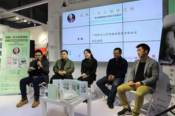 2019年北京订货会期间,广西师大出版社·神秘岛联合季羡林读书会策划举办了:致敬一代大师季羡林——“季羡林留给孩子的人生启蒙书”新书发布会暨季羡林读书会广西分会授牌仪式。发布会邀请到了季羡林读书会发起人王佩芬女士、季羡林研究专家叶新先生、苏州梦想人科技融合出版事业部经理唐蜀垒先生及广西师范大学出版社集团有限公司副总编辑黄毓先生等嘉宾出席。嘉宾们分别从选篇特色、内容优势、多媒体运用及对青少年的积极意义等角度对“季羡林留给孩子的人生启蒙书”进行了阐释,使现场观众得以深入地了解这套孩子能读、易读、愿读、爱读的人生启蒙书。