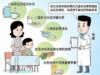 专家建议,肺炎支原体感染期间儿童饮食需要把握这五条原则,均适用于急性期和恢复期:一是保证充足的水分。肺炎支原体感染患儿,如伴有发热的症状,丢失水分较多,所以肺炎期间尽量多补充水分以及富含水分的食物,3—6岁患儿每日饮水量600—800毫升,6—10岁患儿每日饮水量800—1000毫升,发热情况下可酌情加量,建议温开水少量多次饮用。