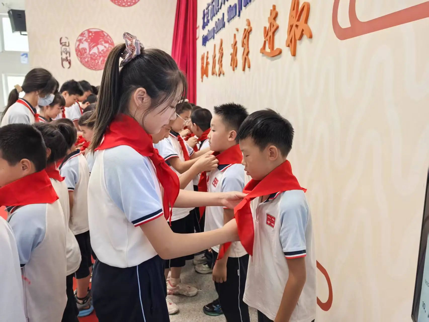 红领巾代代传,老队员们及家长代表为新队员们佩戴上鲜艳的红领巾,期待新队员们能传承少先队精神,争做优秀少先队员。