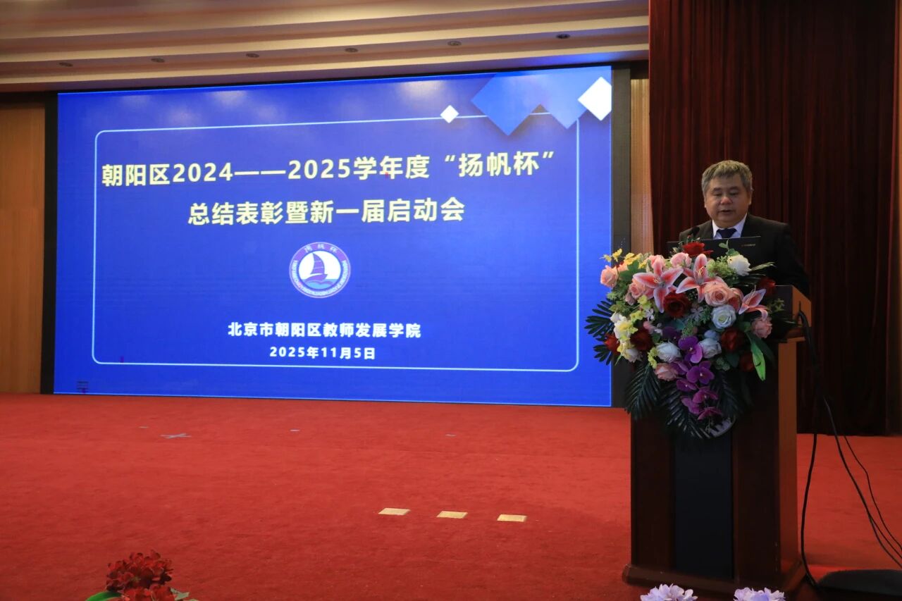 2025年11月5日下午,北京市朝阳区2024—2025学年度“扬帆杯”总结表彰暨 2025—2026学年度启动会在北京市陈经纶中学崇实分校隆重召开。本次活动以“聚力教学技能提升・赋能新师专业远航”为主题,采用“线下主会场+线上直播”形式举行。教师发展学院党总支书记刘强、副院长于永强、孙卫华,北京市陈经纶中学崇实分校校长高殿军,教师发展学院教师专业发展中心主任张东及全体培训教师、中小学校培训管理者、工作三年以内的新教师等共计1000余人参加了活动。