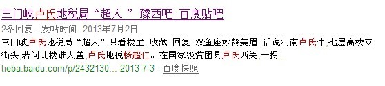 核心提示:编者:卢氏县是河南省豫西地区的国家级贫困县。近日有河南省卢氏县网民在豫西吧、百度吧上报料称:卢氏地税局副局长杨超仁拥有几十套房产,价值几百万元。此帖一经网上报料,震惊了这个贫困县的广大网民,大家在怀疑